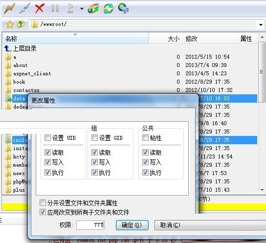用FTP工具把网站下面的data,include文件夹权限设置为777,如下图是用FlashFXP设置: