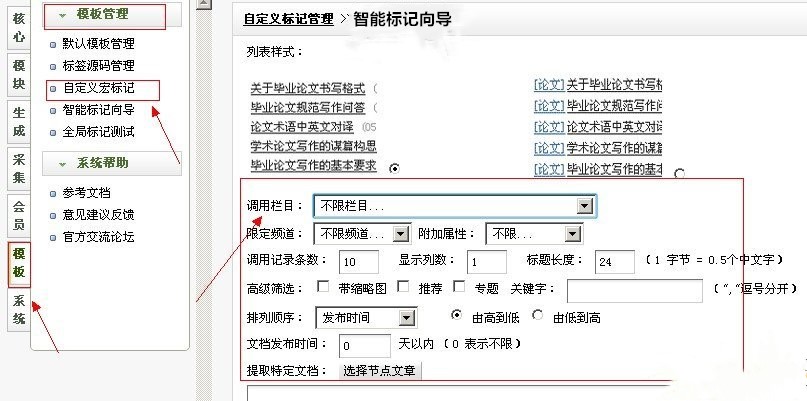 1、在网站后台系统中,进入到“模板”->“模块管理”->“自定义宏标记”,然后点击“智能标记向导”进入智能标记生成向导界面