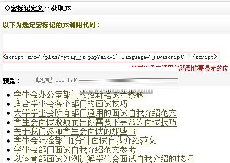 复制“选定的宏标记的JS调用代码,将其添加到搜索页模板的相应位置即可,如下图:
