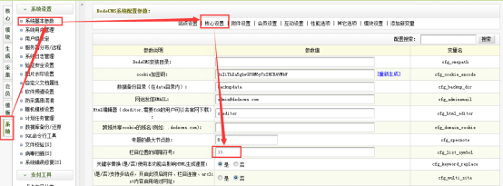 PS:如果要改变中间的连接符号”>”,在”系统”----“系统基本参数”---“核心设置”---“栏目位置的间隔符号”,如下图所示: