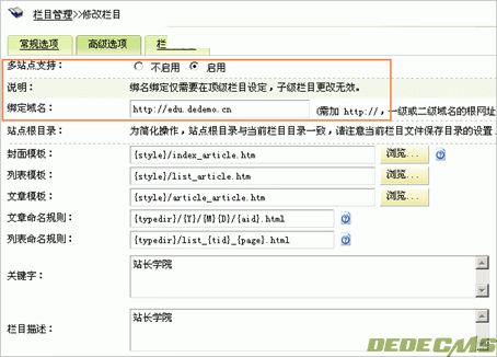 接下来我们来设置系统后台,我们在栏目设置中来绑定二级域名,我们在系统后台[核心]-[网站栏目管理]中编辑“站长学院”这个栏目的信息。我们在高级选项部分先启用多站点支持,并且绑定域名为http://edu.dedemo.cn。(需加 http://,一级或二级域名的根网址)