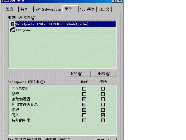 4.4.赋予apache安装目录(比如:D:/apache2.2)以及web目录(比如D:/wwwroot)DedeApache帐号的可读写权限,去除各磁盘根目录除administror与system以外的所有权限,赋予DedeApache安装目录所在的磁盘根目录apache帐户的可读取列目录权限