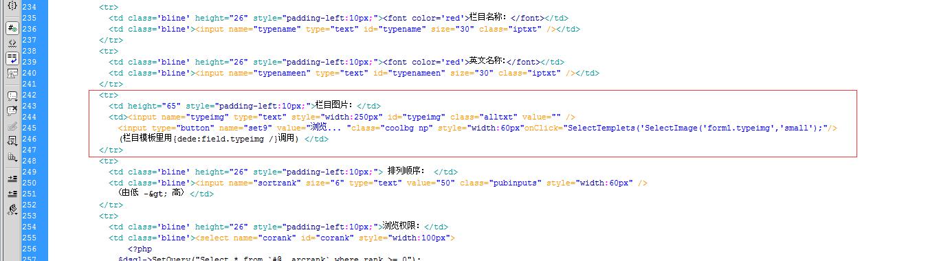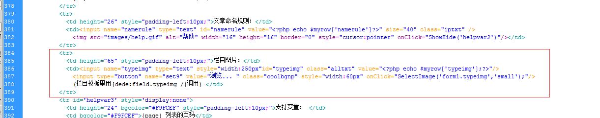 <td><input name="typeimg" type="text" style="width:250px" id="typeimg" class="alltxt" value="<?php echo $myrow['typeimg']?>" /><input type="button" name="set9" value="浏览... "class="coolbg np" style="width:60px" onClick="SelectImage('form1.typeimg','small');"/>(栏目模板里用{dede:field.typeimg /}调用) </td>
