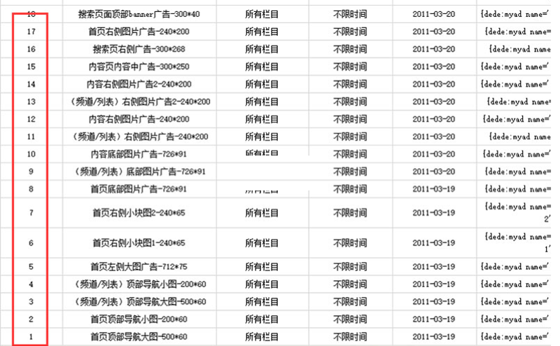 以此类推。注:(aid=1、myad-1.htm)(aid=2、myad-2.htm)其中的数字(1)(2)代表是织梦后台广告编号。如下图: