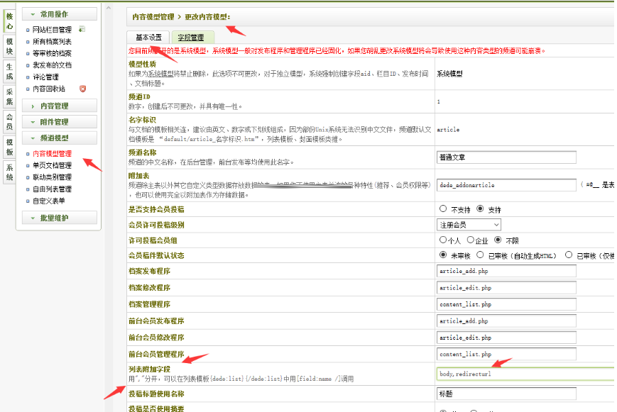 1、在内容模型-普通文章模型(或者其他模型)-基本设置-列表附加字段,添加redirecturl进去