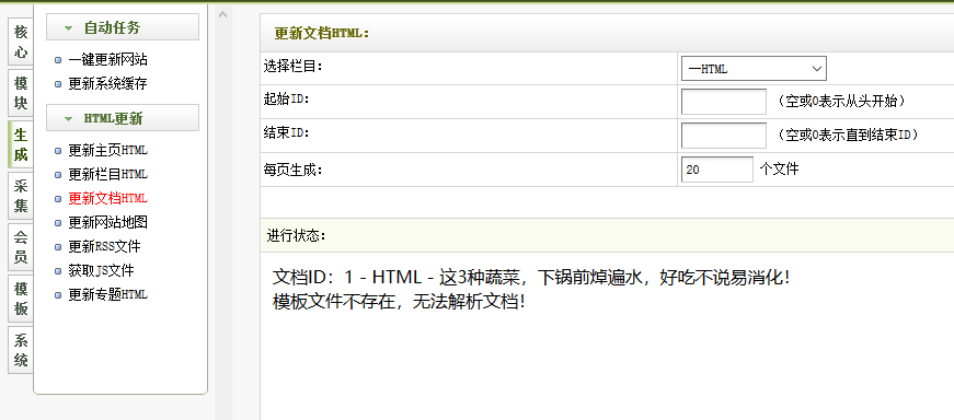- 4、在一键更新网站时提示“模板文件不存在,无法解析文档!”,我们需要单独去生成“更新栏目HTML”和单独去生成“更新文档HTML”,看到底是栏目模板不存在还是文章模板不存在;
