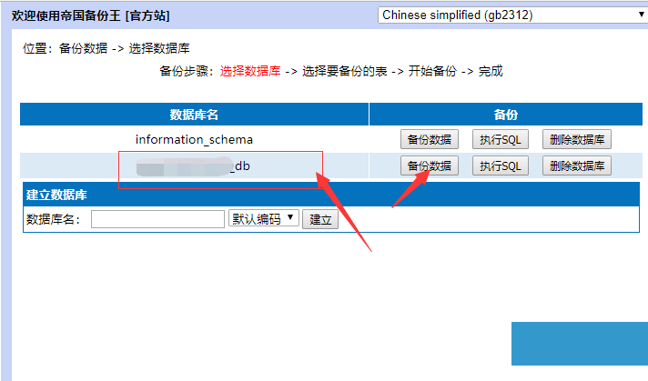 点击左侧的"备份数据",选择需要备份的数据库,点击右侧的"备份数据",