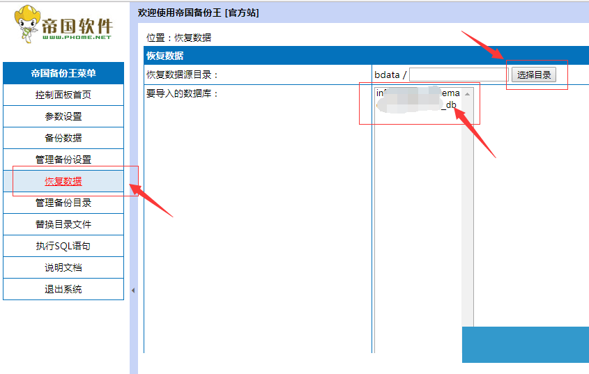 点击左侧的"恢复数据",选择目录、导入的数据库,这样就完成了数据的全部还原,更新缓存,全站更新即可。
