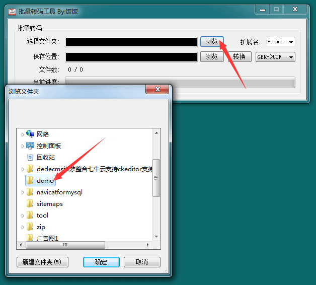 选择整个模板文件夹 -> 选择扩展名为"*.htm" -> 选择保存位置 -> 选择"GBK->UTF" -> 点击"转换"