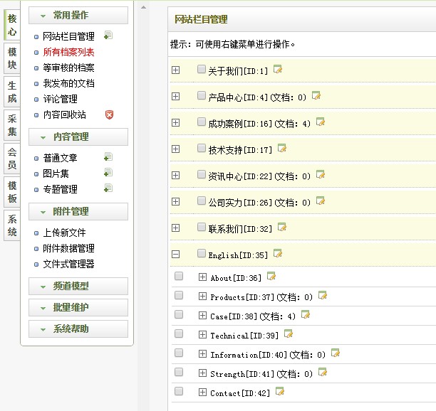 织梦内核创建中英文站点,或者是多语种站点都是一样的方法,英文站点作为一个栏目创建,并复制中文站模板另外命名为英文栏目使用。