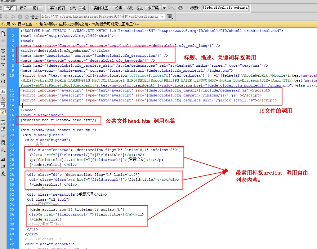 大家可以清楚的看到,模板里都是由HTML代码+织梦标签组成的,那么我们想要对模板修改自如,就必须要了解HTML和织梦标签。