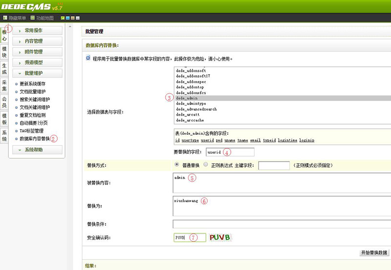依次点击:核心--数据库内容替换--dede_admin--点击字段userid--被替换内容(admin)--替换为新账号(dede58)--输入验证码--确定。