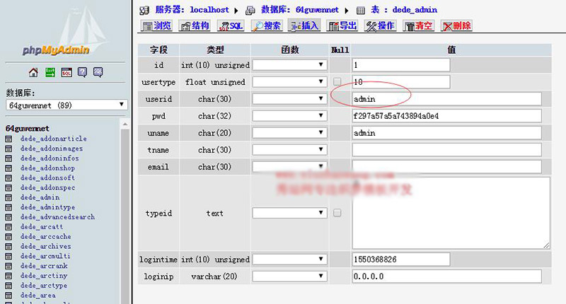 update dede_admin set userid='你自己设置的登录名' where id=1