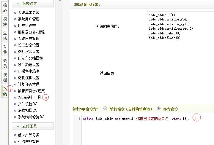 登陆我们dede网站的管理后台,点击系统--系统菜单下的SQL命令行工具,这样就打开了运行SQL命令页面,输入命令然后执行确定。