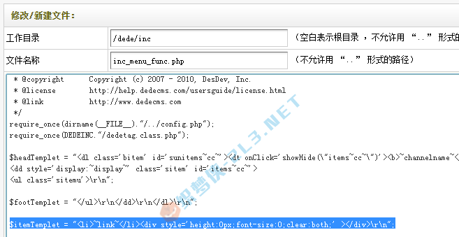 打开 后台文件夹 中的 /dede/inc/inc_menu_func.php 文件