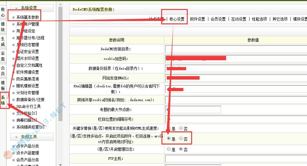 2.系统—>基本参数设置—>核心设置—>(是/否)支持多站点,开启此项后附件、栏目连接、arclist内容启用绝对网址(选择是)