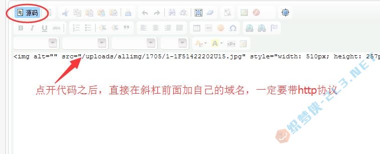 就是发文章传图片的时候,左上角有“源码”两个字,点开它,直接在代码中添加域名