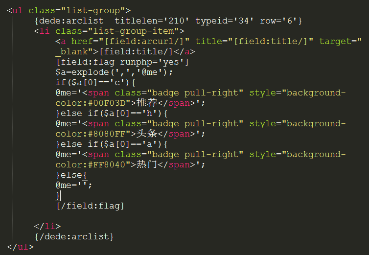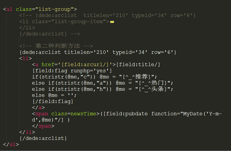 把这段判断代码加到你dede循环列表想要出现图标或者标志的地方即可,再自己修改下样式。代码截图如下: