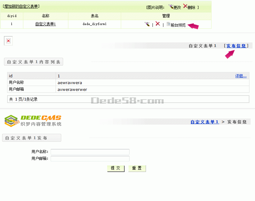 dedecms自定义表单使用步骤:1. 你得建个自定义表单 2. 点击 前台预览 -- 发布信息