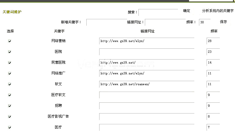 2、新增关键词,这个是手动添加,添加一个关键词后写上相应的链接地址,比如 网络营销 链接地址为http://www.gs39.net/