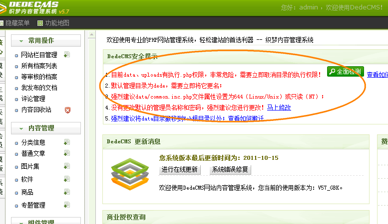 今年11月11日是是百年一次的超级光棍节,正在大家欢度这一非主流节日时,DEDECMS官方推出了“系统安全检测功能”,下边我们来看看这一功能的使用说明。