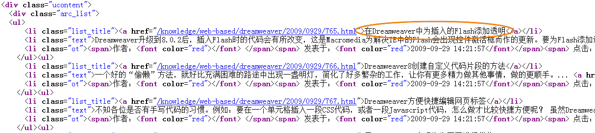 (a)对于"区域开始的HTML",可通过在打开的文章列表首页上,单击右键后选择"查看源文件"。在源文件中,找到第一篇文章的标题"在Dreamweaver中为插入的Flash添加透明",如(图17)所示,