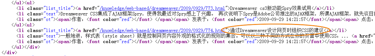 (b)在源文件中,找到最后一篇文章标题"通过Dreamweaver设计网页时组织CSS的建议",如(图18)所示,