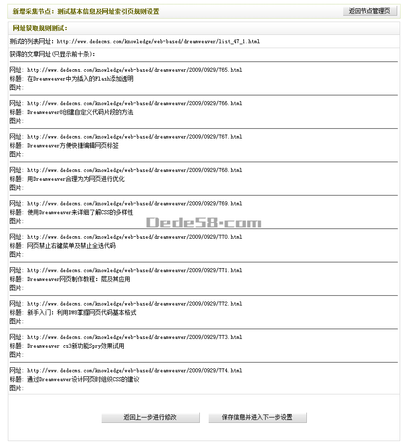 全部完成并检查无误后,单击“保存信息并进入下一步设置“。如果之前设置正确,单击后,将会进入“新增采集节点:测试基本信息及网址索引页规则设置的网址获取规则测试”页面并看到相应的文章列表地址。如(图21)所示,