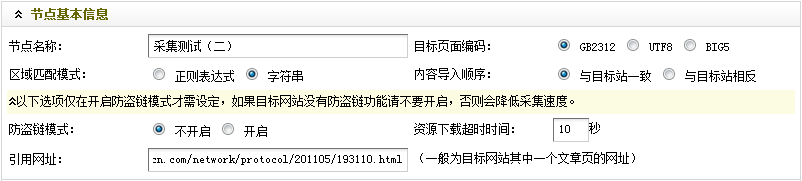其等号后面的代码就是所需的“编码格式”,这里是“gb2312”。对于“区域匹配模式”、“内容导入顺序”和“防盗链模式”,均使用默认值。