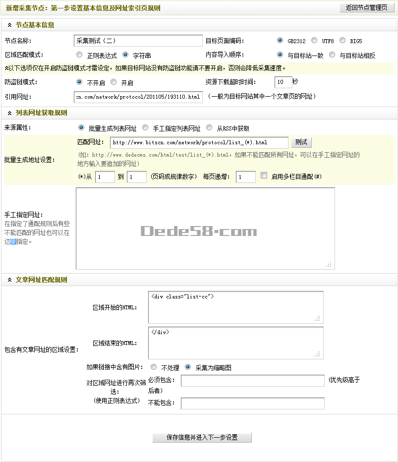 全部完成并检查无误后,单击“保存信息并进入下一步设置“。如果之前设置正确,单击后,将会进入“新增采集节点:测试基本信息及网址索引页规则设置的网址获取规则测试”页面并看到相应的文章列表地址。如(图13)所示,