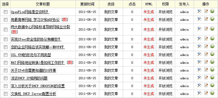 导出采集内容提示“完成所有栏目列表更新”后,单击“浏览栏目”,便可进入网站的相关页面查看到采集到的文章列表及其具体内容。也可在后台管理界面的主菜单中单击“核心”,然后单击“普通文章”,进入“文档列表”页面,查看所采集到的文章列表,如(图36)所示,