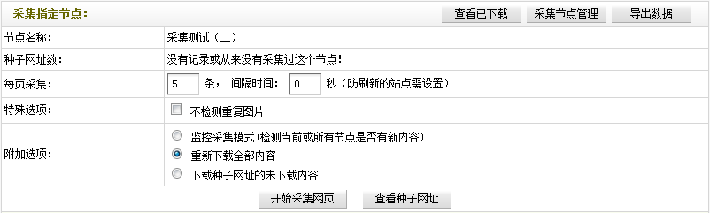 附加选项:此选项一共有3种采集模式可供选择:第一种为“监控采集模式(检测当前或所有节点是否有新内容)”,选取后,系统只会采集指定节点中更新的内容;第二种为“重新下载全部内容”,选取后,系统会采集指定节点中的全部内容;第三种为“下载种子网站的未下载内容”,选取后,系统只会采集指定节点中未下载过的内容,包括以前没下载的和更新的内容。
