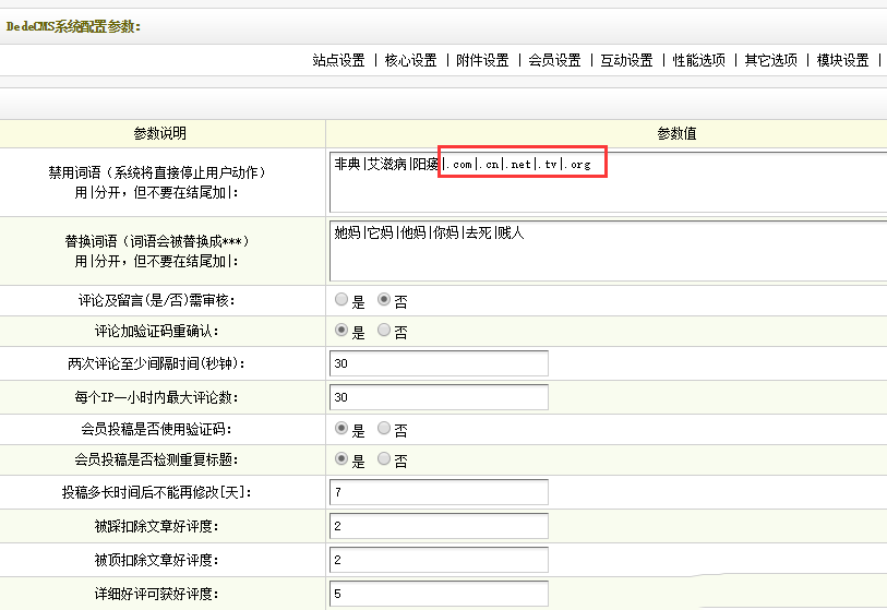 找到系统基本参数---互动设置---在禁用词语中加入禁止的域名后缀,我是加入了如下内容: