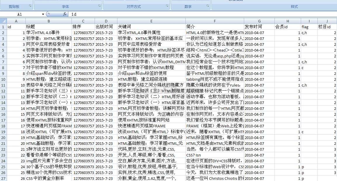 ->setCellValue('J1', '栏目id');