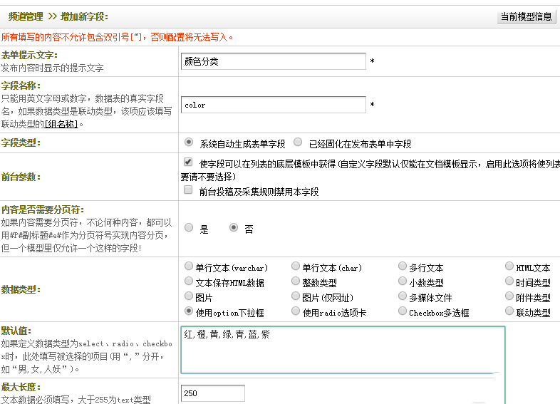 这里需要注意的就是字段类型的选择,字段类型需要选择“使用option下拉框”或者“使用radio选项卡”,如下图所示: