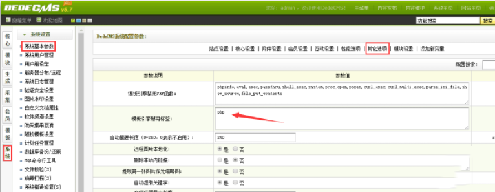 登录后台 >> 系统 >> 系统基本参数 >> 其它选项 >> 模板引擎禁用标签:php