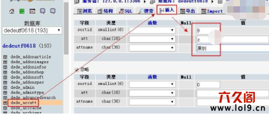 (4)之后打开表dede_arcatt,点击”插入“添加一条数据,内容如下图: