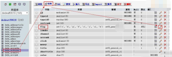 (3)进入phpmyadmin,打开dede_archives,点击“结构”,找到flag,点击flag后面的更改按钮,如下图:
