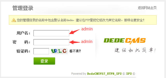 第四步:点击“登录进入后台” 或者输入http://您的域名/dede/ 为了安全起见,dede这个文件夹的名字一定要改掉,这个文件夹就是你后台登陆的网址