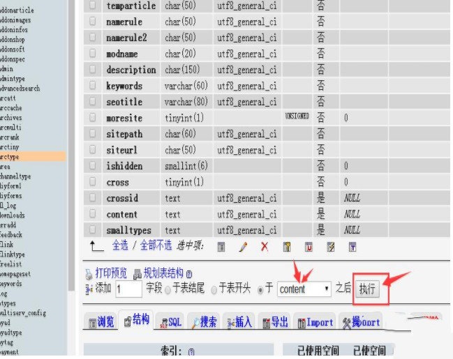 1:dede_arctype表然后选择结构,在底部选择与content之后(不填也行),点击执行。