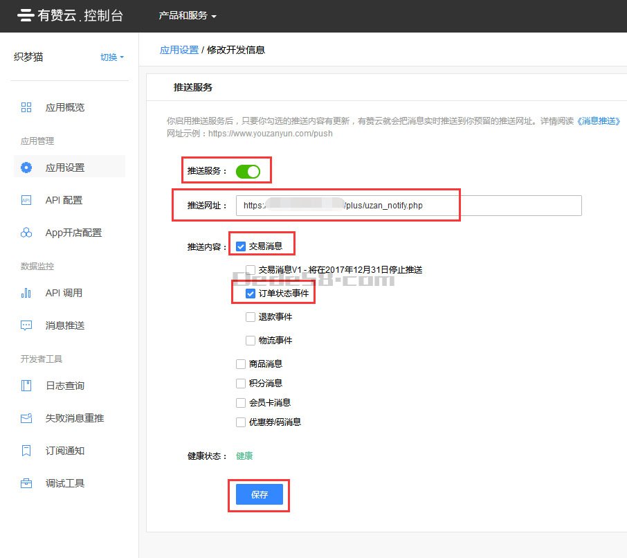 10.设置推送网址。推送网址设置为:http://你的域名/plus/uzan_notify.php (注:该网址必须是外网可以访问的网址,不支持本地调试),勾选交易信息->订单状态事件。