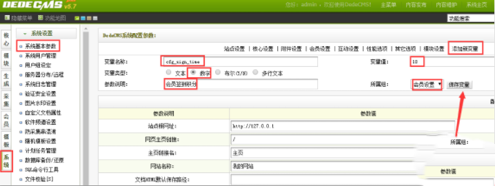 点击保存变量即可(变量值10表示签到增加10积分),如下图所示