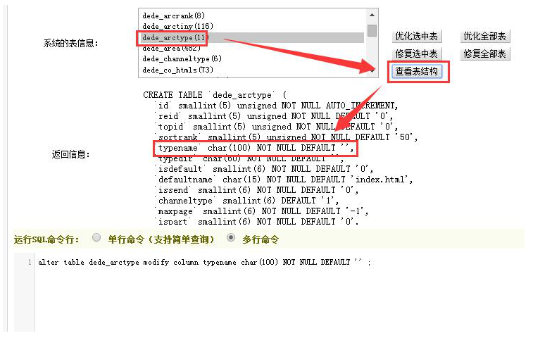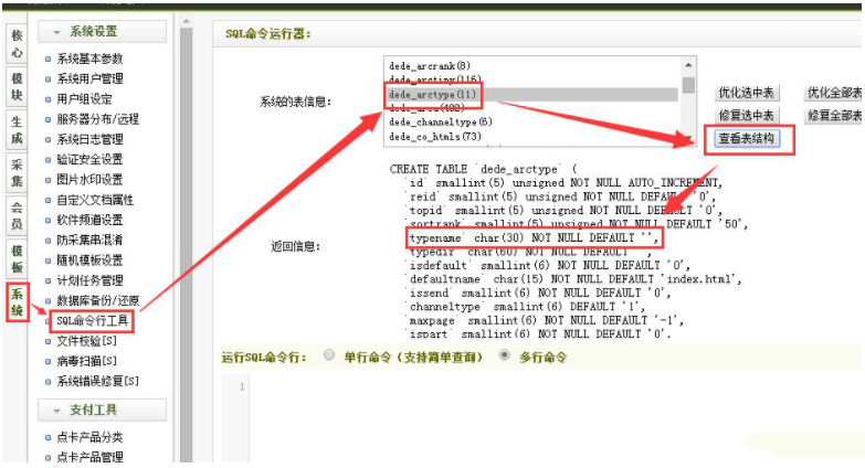 1、织梦后台——系统——系统设置——SQL命令行工具,打开工具后,我们可以先查看一下默认字段的情况,选择表dede_arctype,点击查看表结构,就能看到栏目字段的信息typename 。如下图: