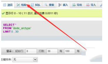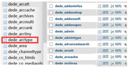 2、 登录数据库中对应的表,其中控制栏目字节数的表是dede__arctype 表,打开数据库后,我们打开这个表。