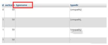 3、在表中我们可以看到我们的栏目名称,找到控制栏目名称的字段,控制栏目名称的字段是typename字段,图中红框已经标出。