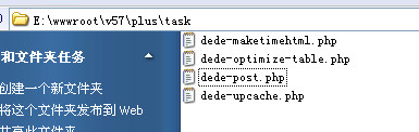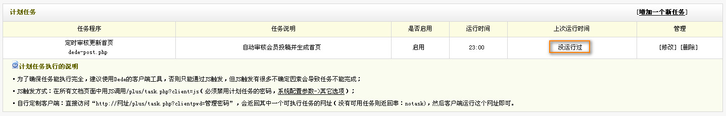 6.触发方式:为了确保任务能执行完全,建议使用Dede的客户端工具,否则只能通过JS触发,但JS触发有很多不确定因素会导致任务不能完成; •JS触发方式:在所有文档页面中用JS调用/plus/task.php?client=js(必须禁用计划任务的密码,系统配置参数->其它选项); •自行定制客户端:直接访问“http://网址/plus/task.php?clientpwd=管理密码”,会返回其中一个可执行任务的网址(没有可用任务则返回串:notask),然后客户端运行这个网址即可。