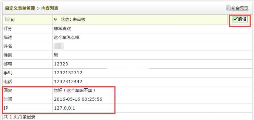 注:huifu字段,根据需要增加一个value=‘您的字符’,不然后台看不到也修改不了。
