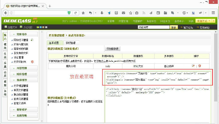3-1、进入你的某个模型 - 字段管理,在【字段配置】最顶端添加如下代码