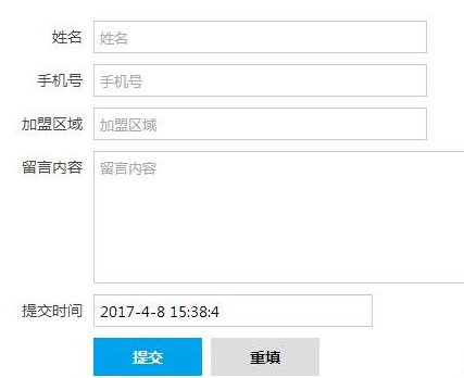 <form action="/plus/diy.php" enctype="multipart/form-data" method="post" name="form" onsubmit="return CheckForm();"> <input type="hidden" name="action" value="post" /> <input type="hidden" name="diyid" value="1" /> <input type="hidden" name="do" value="2" /> 提交时间 <input name="mytime" value="" type="text" id="mytime" /> <!-- 如不需要在前台显示的话可以修改type="hidden" --> <script type="text/javascript"> window.onload = function(){ var nowDate = new Date(); var str = nowDate.getFullYear()+"-"+(nowDate.getMonth() + 1)+"-"+nowDate.getDate()+ " "+nowDate.getHours()+":"+nowDate.getMinutes()+":"+nowDate.getSeconds(); document.getElementById("mytime").value=str; } </script> <input type="hidden" name="dede_fields" value="mytime,textchar" /> <input type="hidden" name="dede_fieldshash" value="849a871768b5942ee259e8f7af736194" /> <label><input class="btn_tj" type="submit" name="Submit" value=" 提交" /></label> </form>