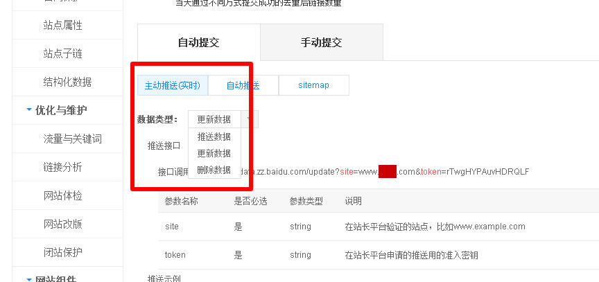 1、以上二个文档,对应的是百度站长给出的,主动推送(实时),下边的数据类型中,有推送,更新,删除,三个选项,我们主要达到新文章可以推送,更改的文章也可以更新就可以了,至于删除文章,直接做404页面就行了。